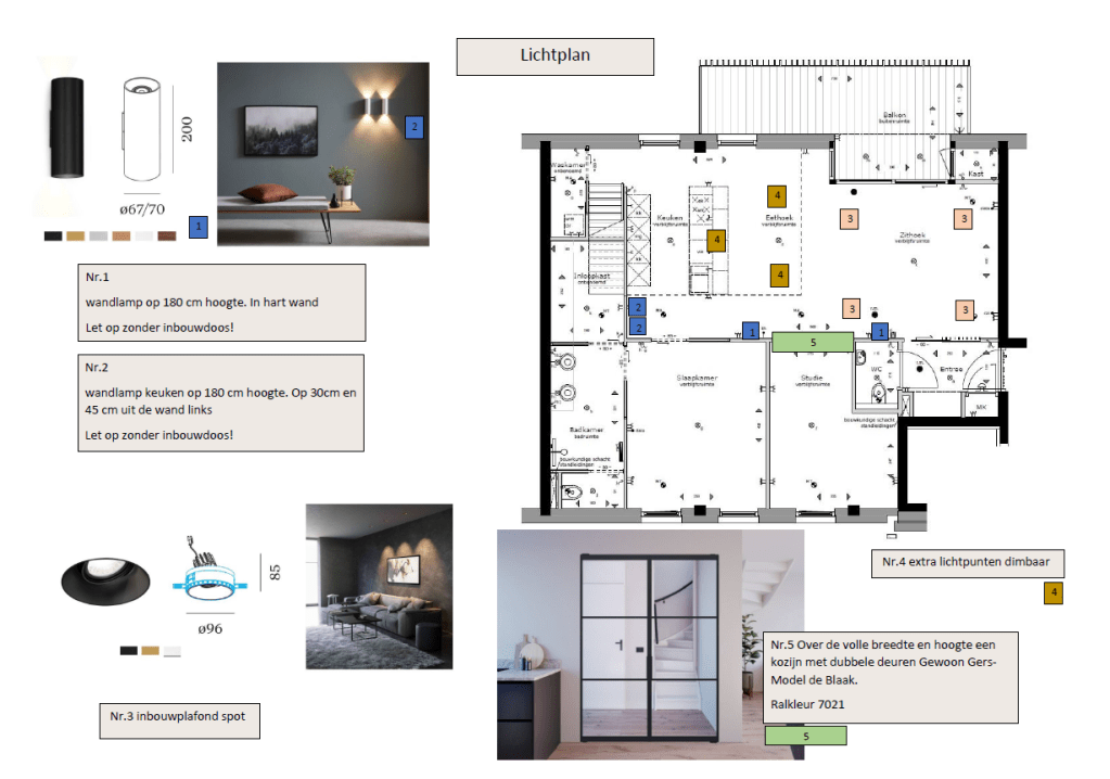 Dit bestaat uit een uitgewerkte plattegrond met lichtpunten en een sfeerbeeld van de lampen. Dit gaat altijd in combinatie met een ontwerp.