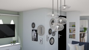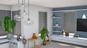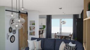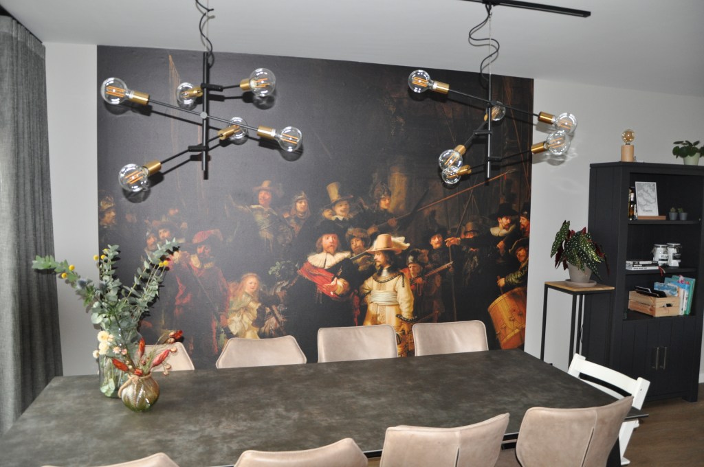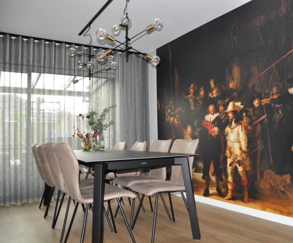 Voor deze opdracht gingen we aan de slag met bestaande elementen. Daarbij voegden we een nieuwe vloer en raamdecoratie toe. De muren kregen een nieuwe kleur, nieuwe lampen, nieuwe eettafel en stoelen. Er kwam een mooie Mural. Kortom een nieuwe woonkamer!
