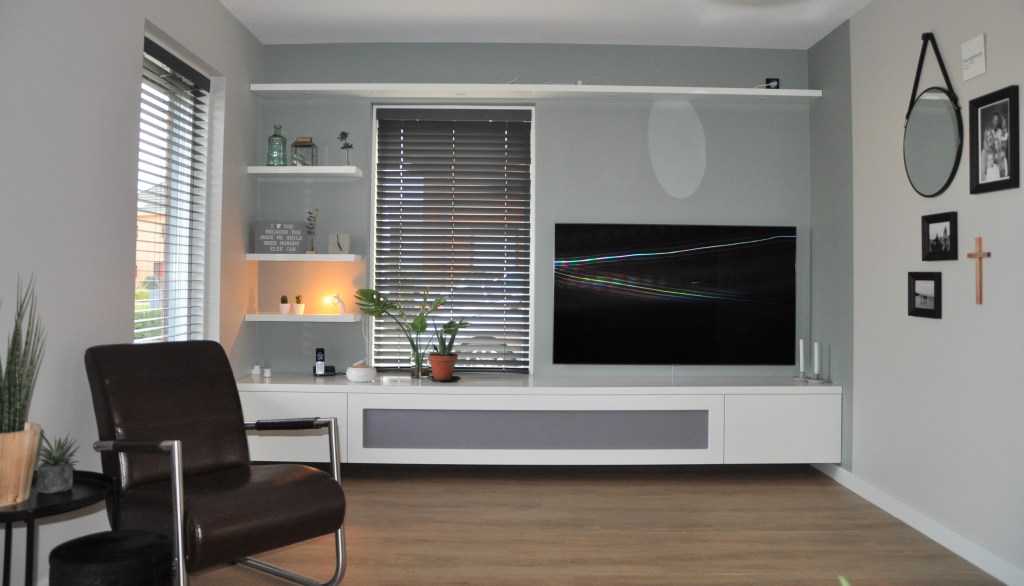 De woonkamer met oude vloer en tv meubel. De muur wordt niet benut, zodat de kamer kleiner lijkt dan hij is. Met een meubel van wand tot wand krijg je een optisch bredere woonkamer!