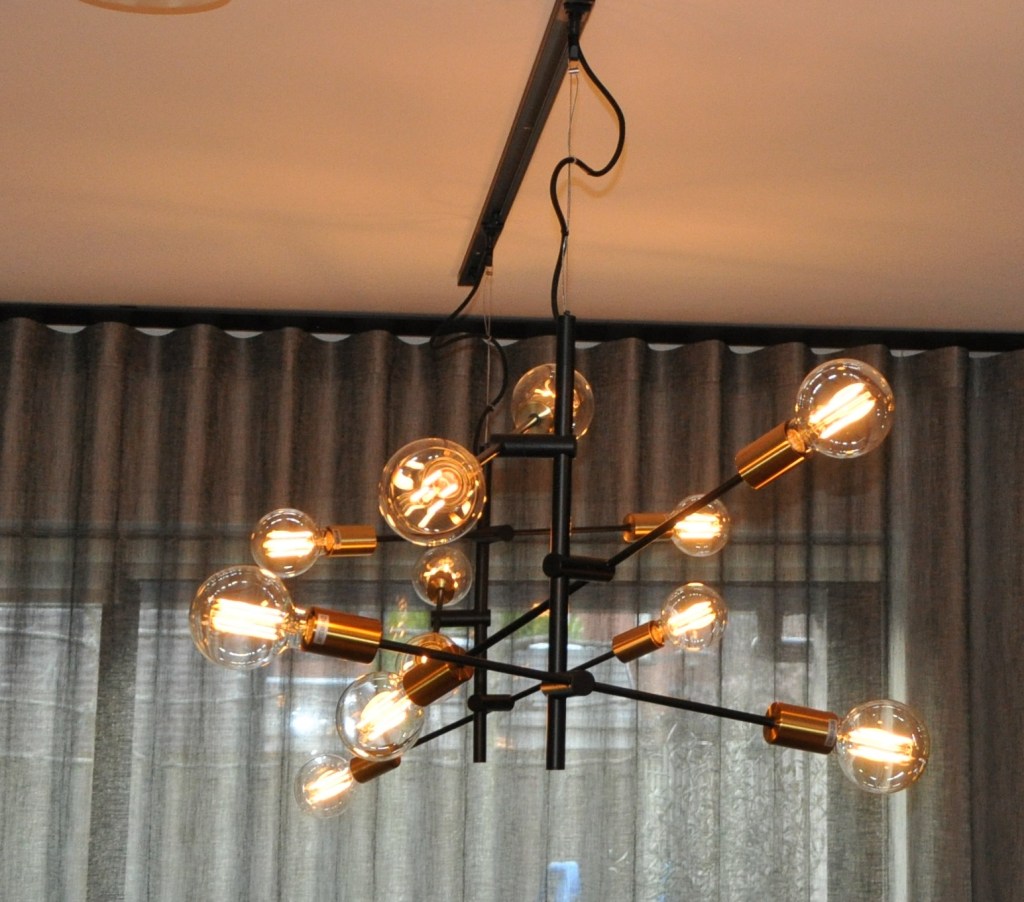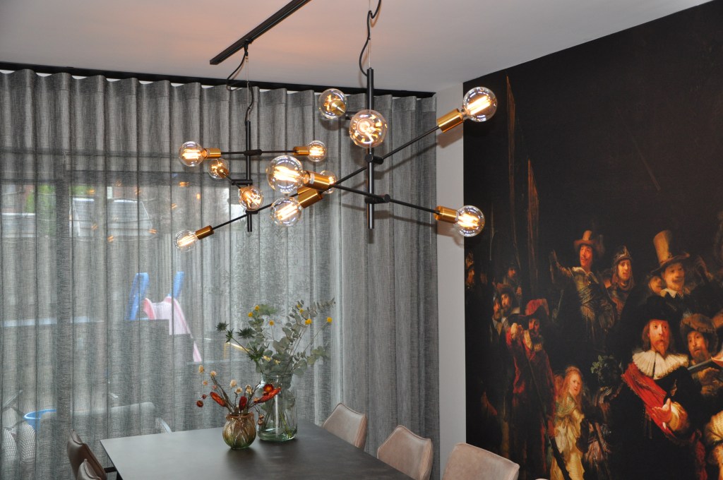De nieuwe eettafel is uitschuifbaar tot 300 cm. De lampen zijn in een rail geplaatst, zodat je deze bij een grote groep eters, deze ook mooi in het midden boven de tafel kunt hangen.