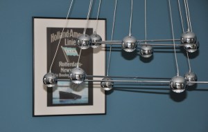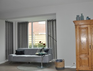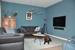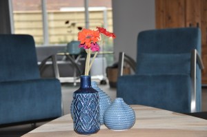 De stoelen in de zitkamer zijn opnieuw bekleed met een bijpassende blauwe stof. De salontafels, het kleed, de lampen en de nieuwe bank in de serre zijn van het merk Xooon. Een heel betaalbaar merk met een mooie moderne uitstraling.