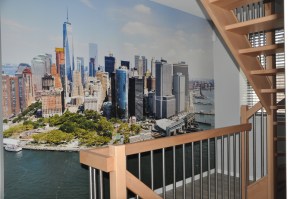 De wanden zijn in Pure&Original krijtverf geschilderd, voor een mooie poedermatte uitstraling. De basis is de kleur Ashes, gecombineerd met de kleur Country Blue. Boven is de grijsblauwe kleur Oxford Blue gebruikt, ook weer in combinatie met de Ashes.