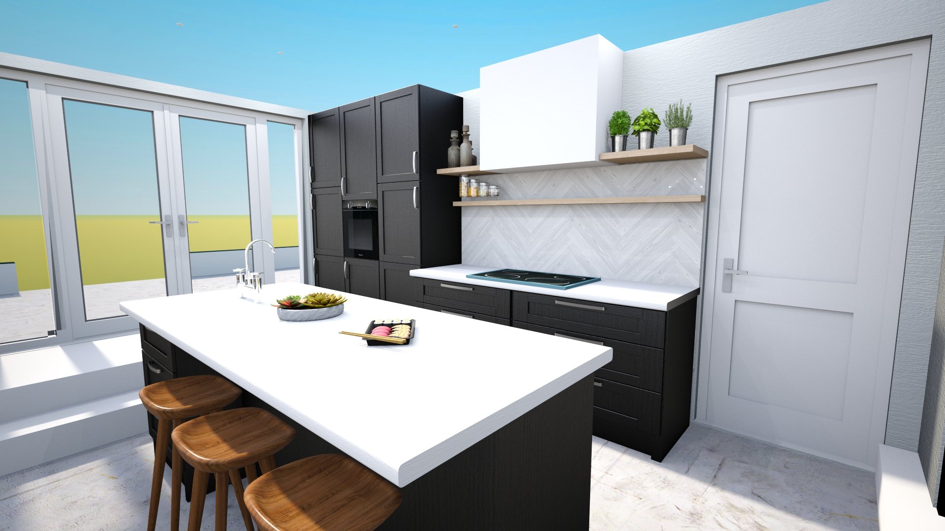 De keuken is uitgevoerd in een zwarte houtstructuur. Het blad is van marmer en de tegeltjes in visgraat hebben een lichte taupekleur. Door de verhoging in de keuken is deze gebouwd met de vorm van de trap mee. Bij het eiland staan nog een paar mooie barkrukken.