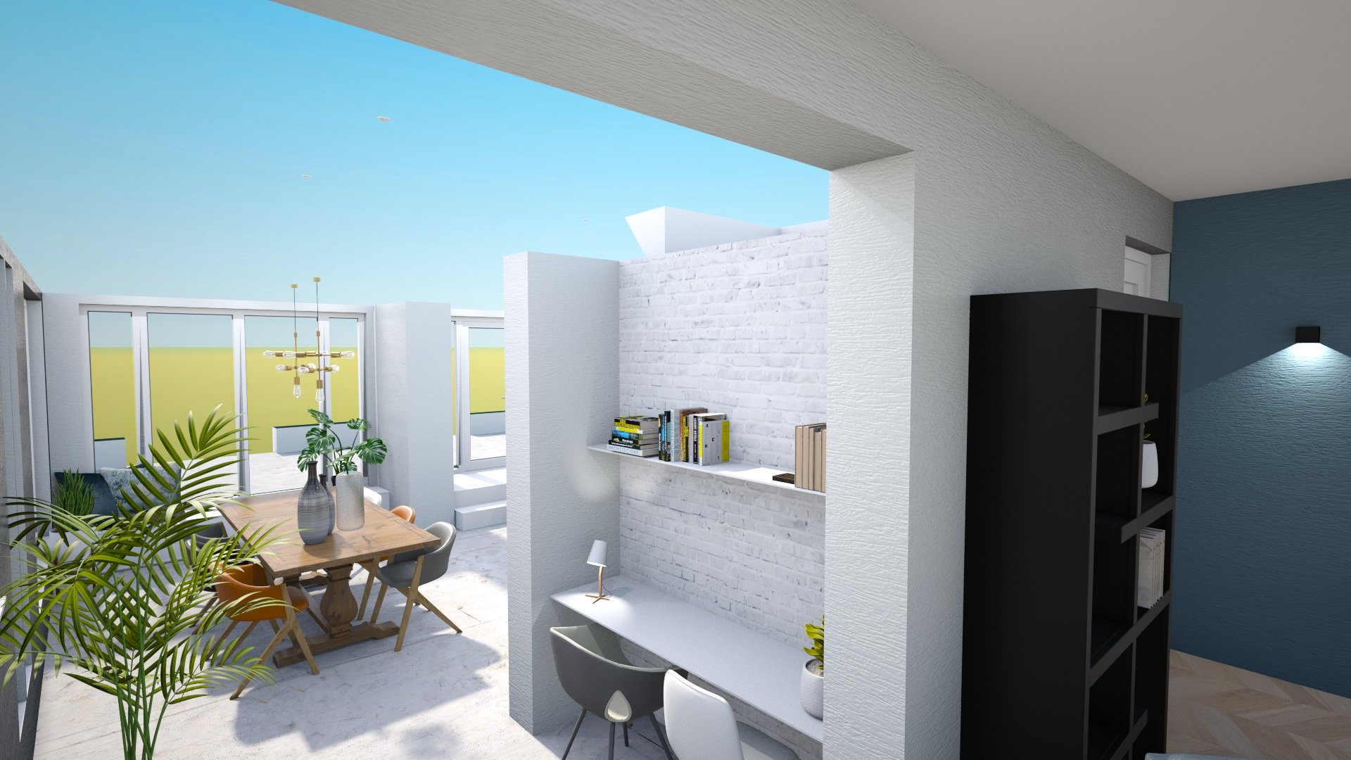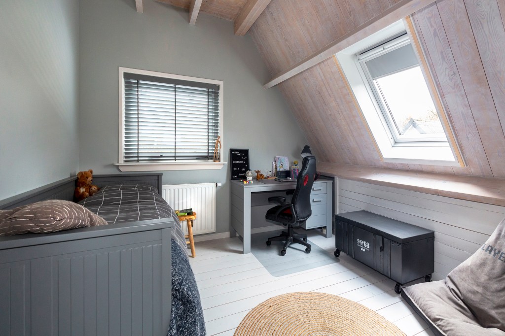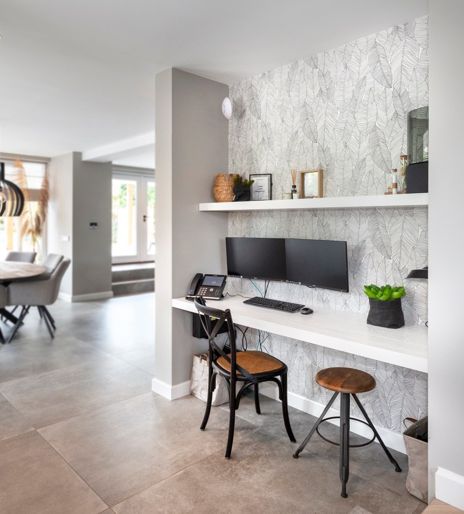 In de ruimte tussen de woonkeuken en de woonkamer hebben we een werkplek gecreëerd.