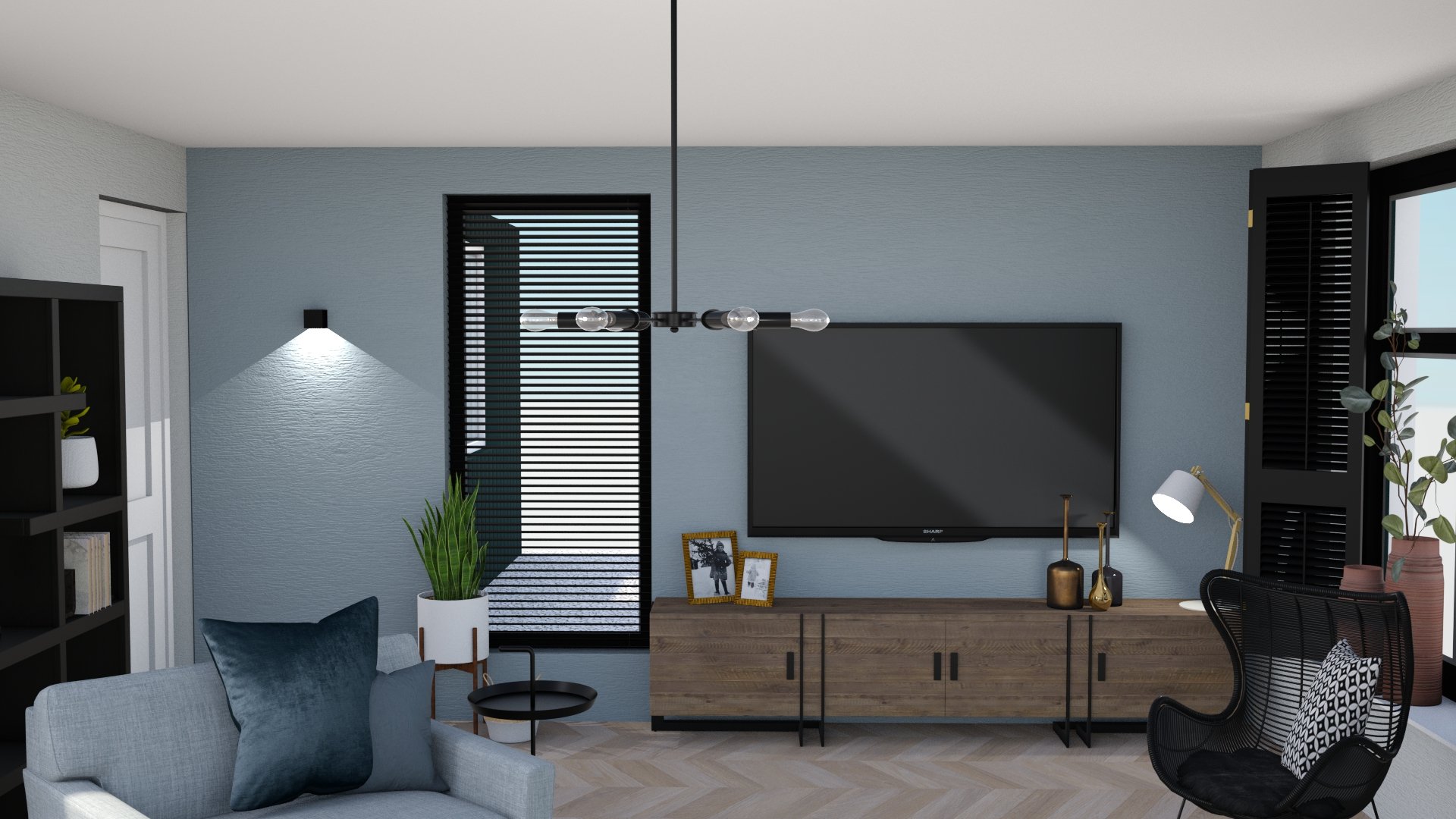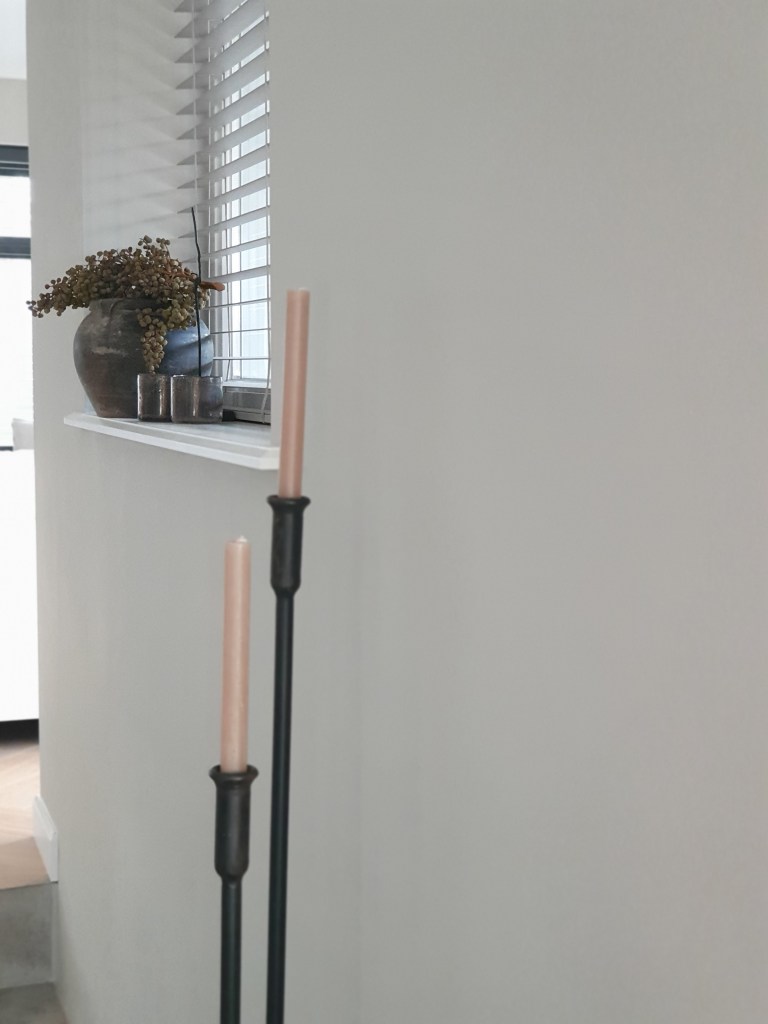 De vloer in het woongedeelte is een eiken visgraatvloer. De wanden zijn geverfd in een rustige matte basiskleur van Pure&Original, die op de hele begane grond terugkomt. De accentwand is geverfd in een diepe donkerblauwe staalkleur. Alle kozijnen zijn donker geverfd. Het oorspronkelijke huis is aan de buitenzijde wit en dit geeft een krachtige uitstraling.