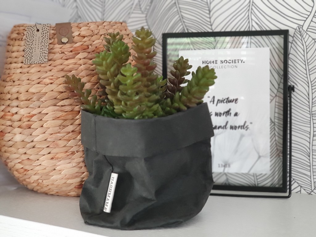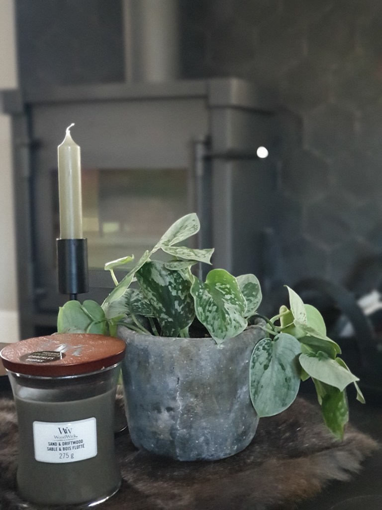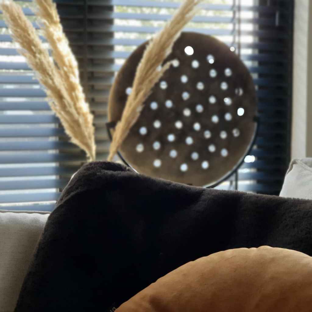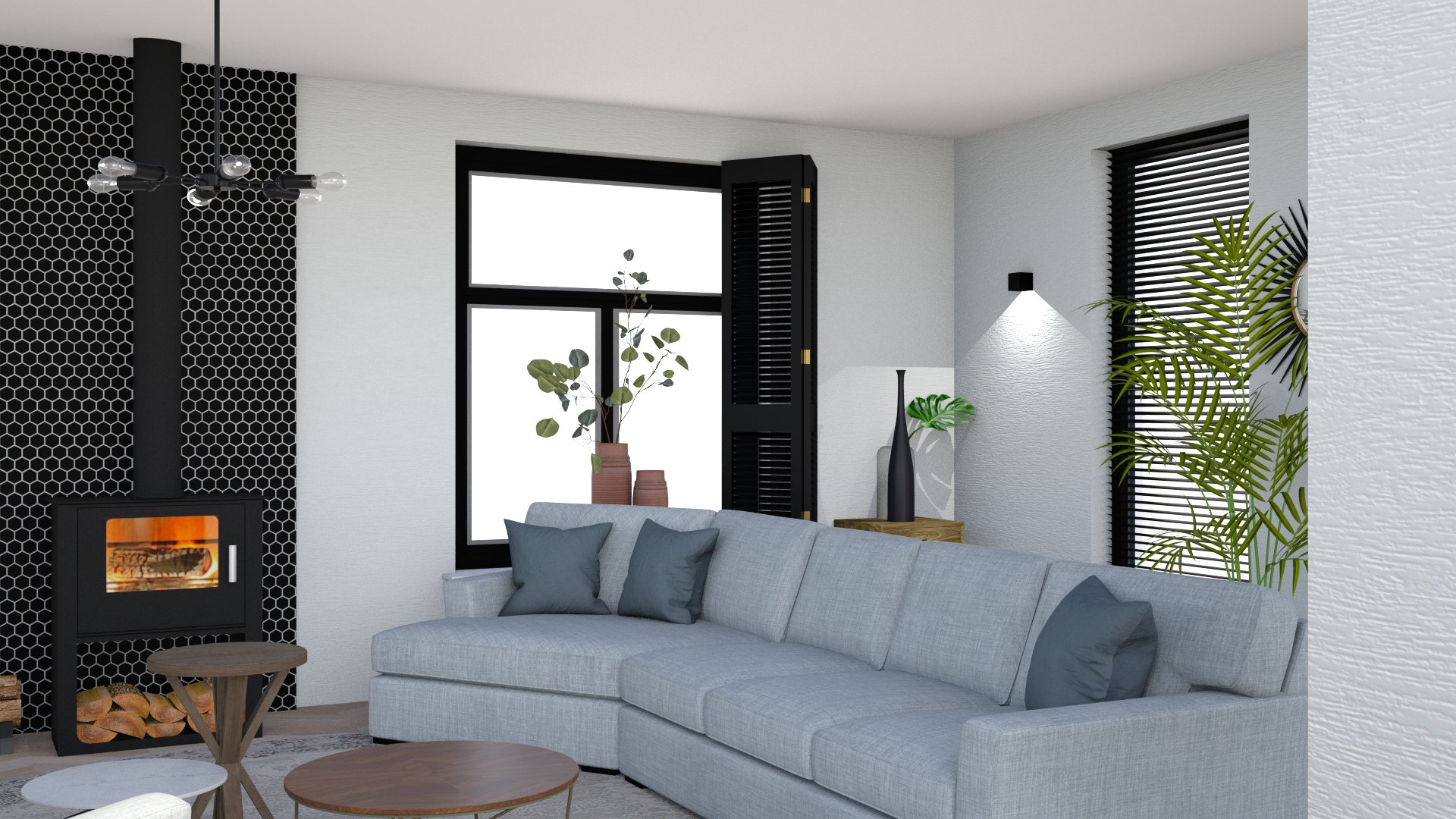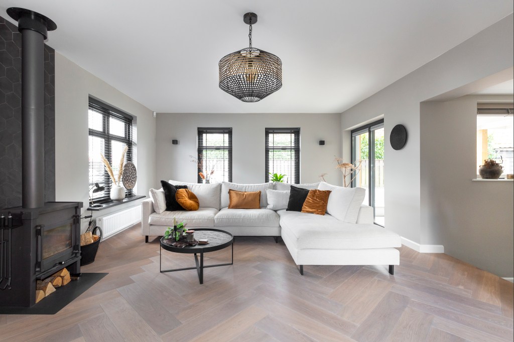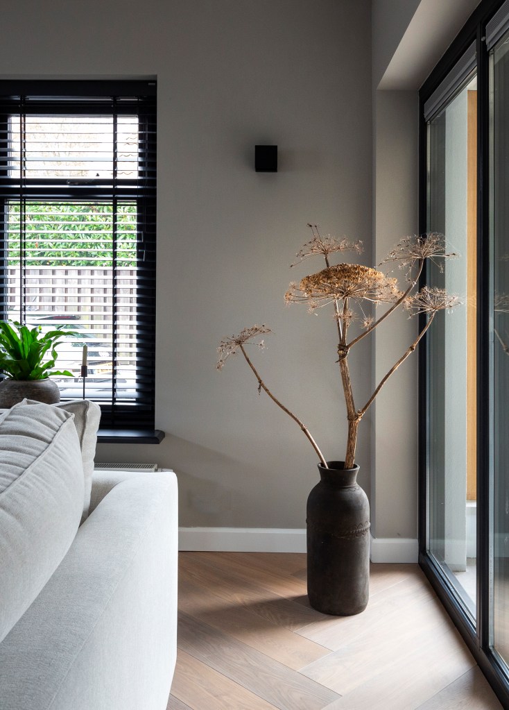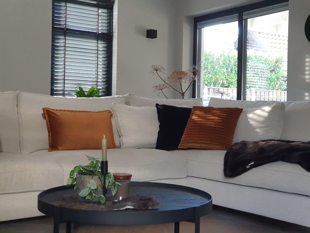 Achter de Jacobus houtkachel hebben we mat zwarte hexagon tegeltjes geplaatst. Voor de ramen hangen houten jaloezieën uit de InStyle raamdecoratie collectie. Er is een nieuwe bank aangeschaft in een offwhite stof. De losse stoel is van vergrijsd-groen velvet.