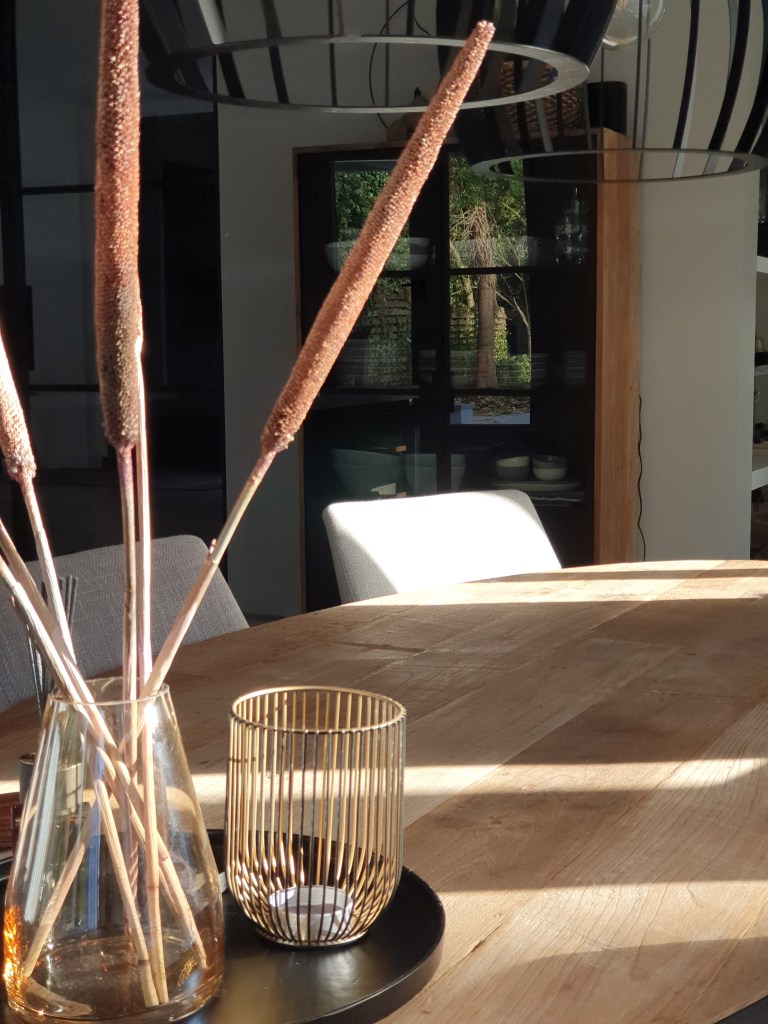 Op de vloer licht een keramische tegel van 100x100cm in een warme betonlook. Er is gekozen voor een ovale tafel, mede om de rechte vormen in de ruimte wat te verzachten. De vensterbanken zijn zo gemaakt dat ze als zitbank kunnen worden gebruikt.