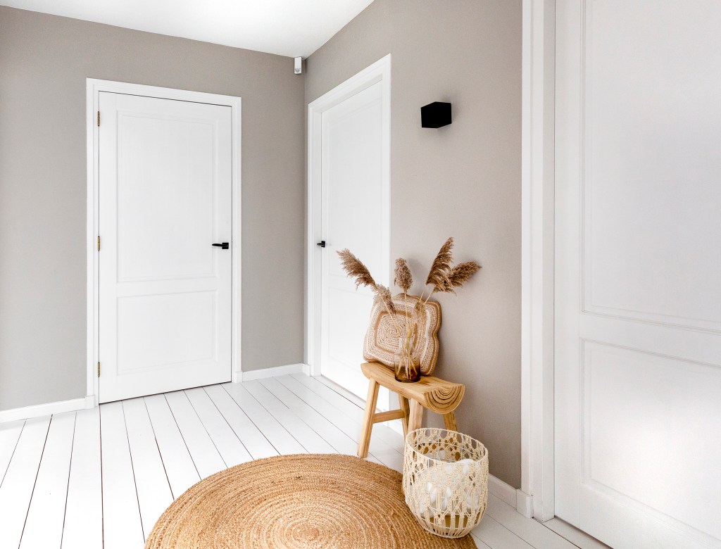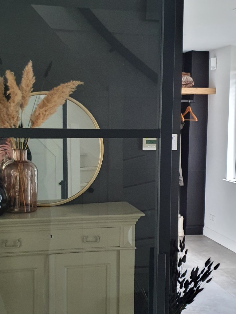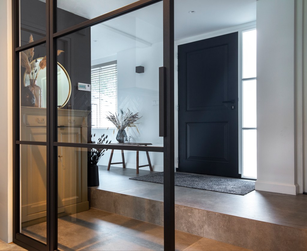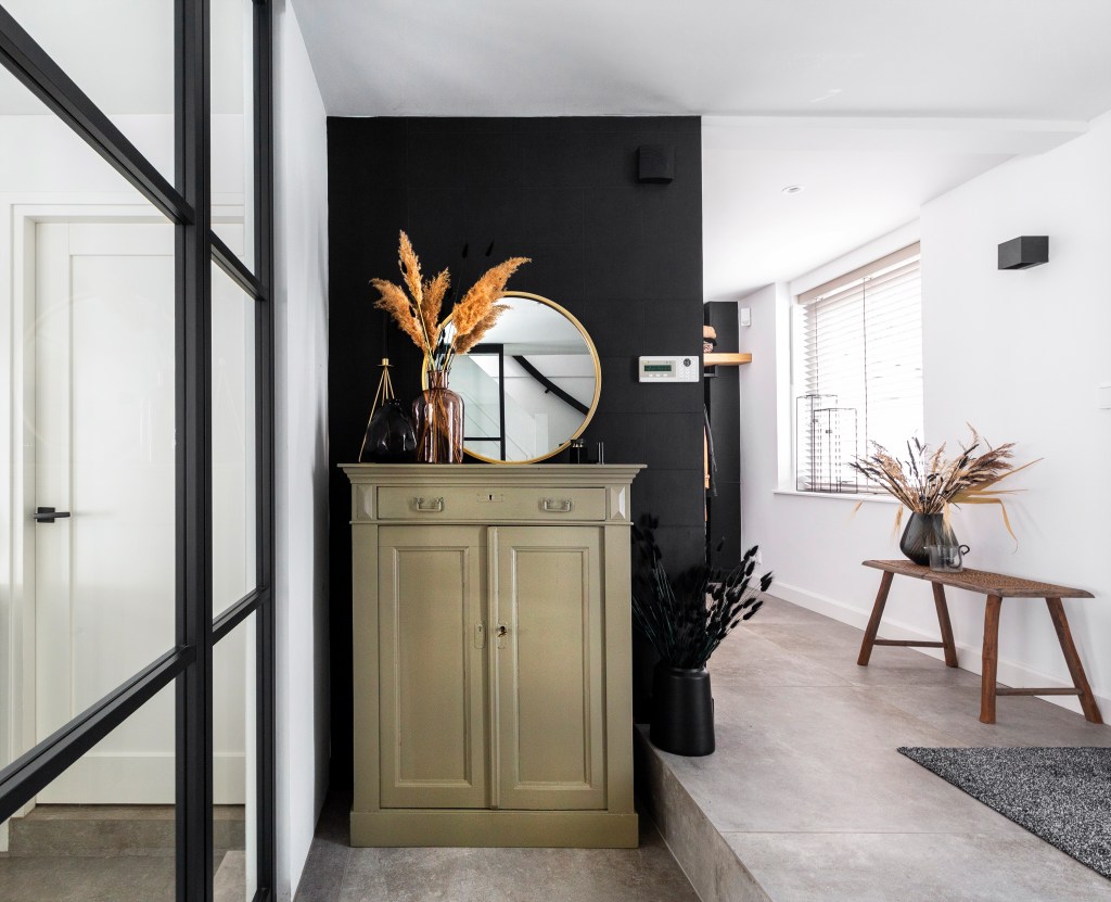 De hal is gescheiden van de keuken d.m.v. taatsdeuren. In de hal hebben we wederom een split level. Hier ligt dezelfde vloer als in de woonkeuken. Op de wand hebben we een zwart leerbehang aangebracht. De overige wanden en deuren zijn krachtig wit. Dit zorgt voor een frisse hal. De zwarte wandlampen zorgen voor de juiste sfeer.