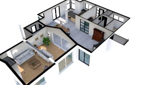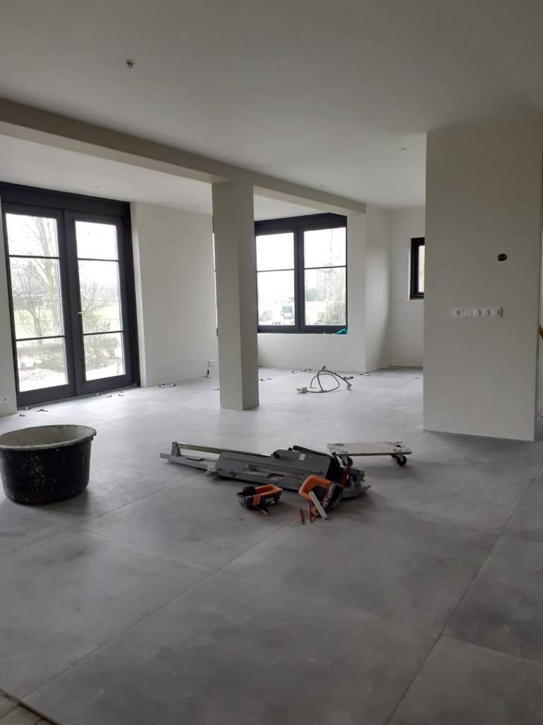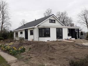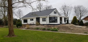 Als je aan komt rijden zie je een geweldige woning, geheel wit gestukt met mooie grote donkere deuren en ramen en prachtig gelegen op een kleine terp. Je betreed de woning via de imposante voordeur die centraal in het midden is geplaatst, in de ruime hal ligt een schitterende keramische tegel van 100x100cm, die ook in de woonkeuken is doorgelegd. De woonkeuken is een combinatie van eiken hout en donker gelakte deuren.