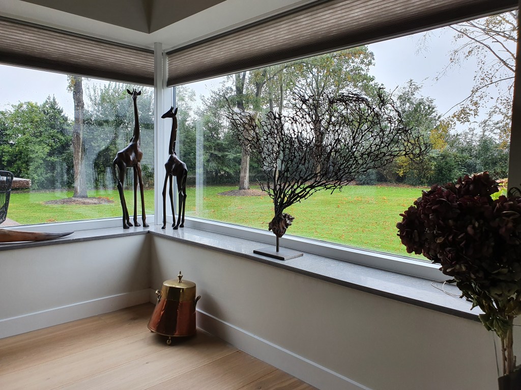 De Woonkeuken met kookeiland is in de aanbouw geplaatst die aan de voorzijde van de woning is geplaatst. Tussen de keuken en zitkamer zijn het eetgedeelte en leeshoek gerealiseerd. Vanuit de eetkamer heb je een prachtige doorkijk naar de zitkamer, die een trapje lager ligt, een zogenaamde zitkuil, zoals je die vroeger vaker tegenkwam Hier ligt een prachtige houten planken vloer. De bestaande haard is aangepakt en heeft een moderne gashaard gekregen. Hij is in zijn geheel gestukt en er is een prachtig natuurstenen tableau omheen geplaatst. Een sieraad in de woonkamer. Neem dan ook nog het prachtige behang van Elites en de schitterende meubels, gecombineerd met antiek en het plaatje is compleet!